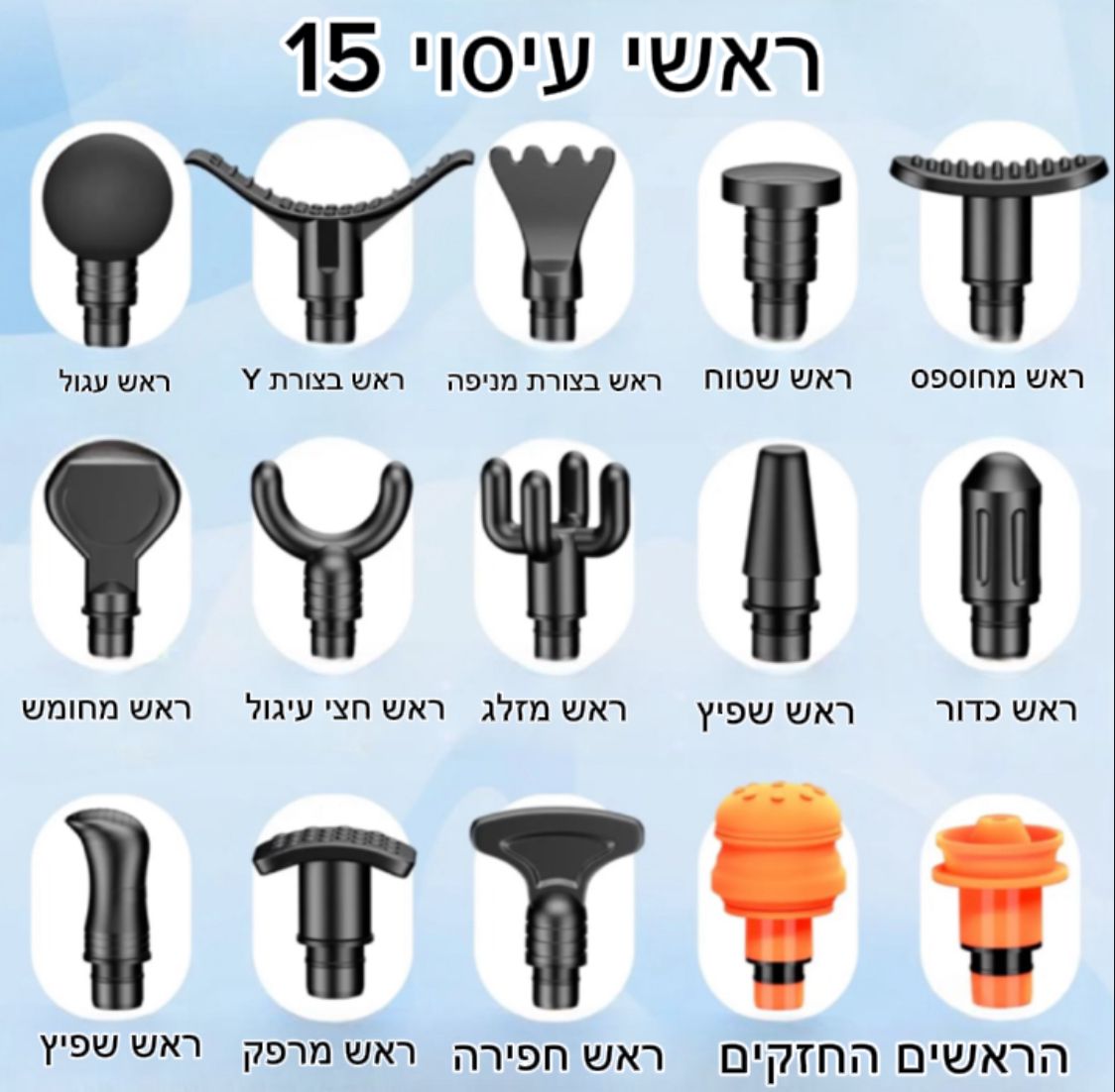 למכשיר יש 15 ראשי עיסוי כדי שתבחר את הראש עיסוי המתאים לכאביך ☑